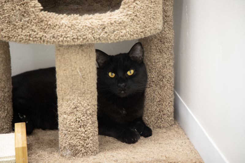 Mittens is a handsome tuxedo kitty with long white whiskers and a cute stripe down his nose. He keeps things drama-free with the other cats and would make the perfect companion for someone who loves observing feline antics. While he’s still learning to trust people, he is full of personality and fun to watch as he does his thing.