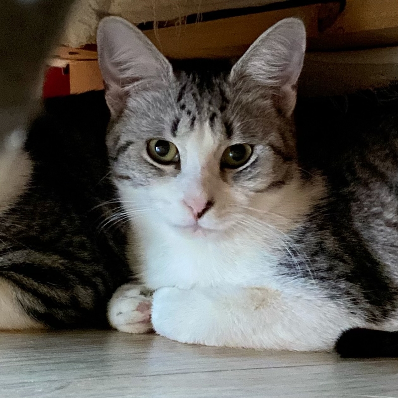 Maya is everything you are looking for in a kitten. She is adorable and fun! Maya has been growing up with her mom and sister. Having a super outgoing sister, Maya tends to let her lead, and then emerge shortly after her.